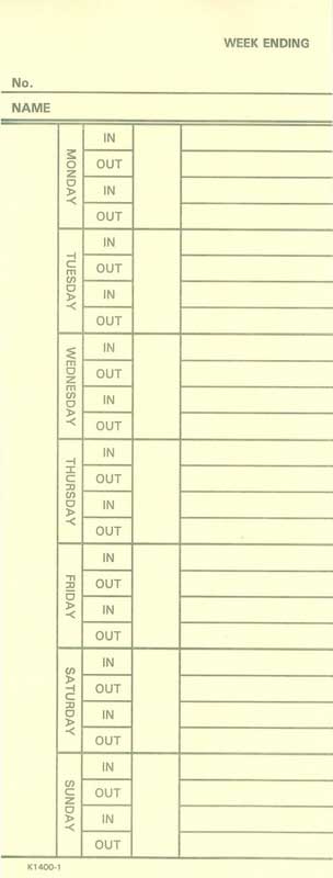 Time card form number K-1400, compatible with all standard front load time stamp clocks from Amano, Acroprint, Compumatic, Icon, Lathem, Simplex, and others...